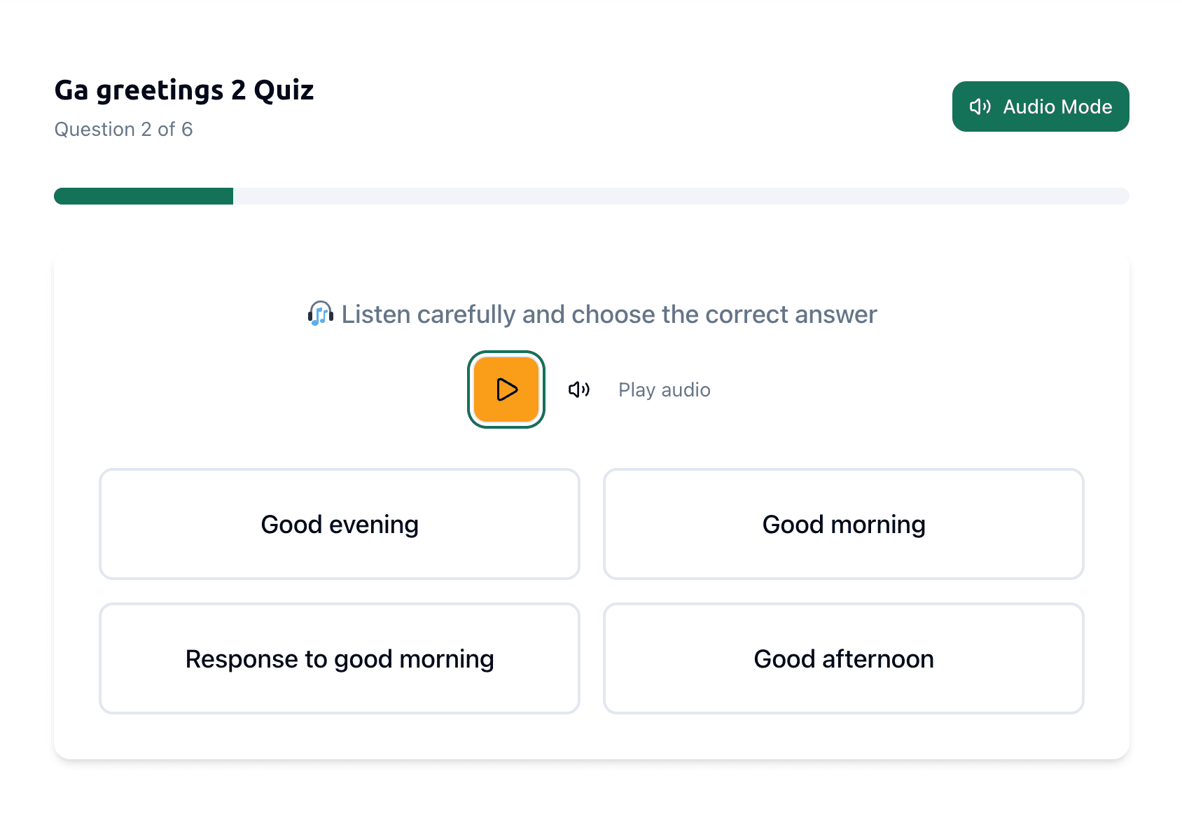 - Earn While You Learn: Need motivation? We’ve introduced Cowries—our unique digital currency inspired by African history. Complete a lesson? Earn Cowries. Ace a quiz on Ga greetings? Earn more Cowries. You can track your wealth alongside your knowledge!